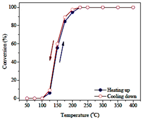 Differently-shaped hysteresis curves such as, normal, inverse or rectangular shape, occur due to inhibiting species accumulation on the surface during temperature ramp-up which was reported for nanocrystalline CuCr2O4 spinel catalysts in small-scale monolithic reactors, as shown in Figure 8. The small hysteresis is attributed to arise from high gas hourly space velocity (GHSV) of feed gas (60,000 mL/gh) which inhibits the formation of hot spots in the catalyst bed [142].