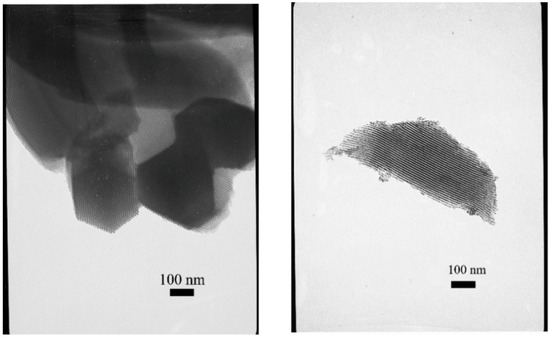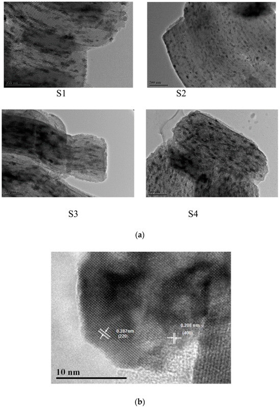 After the comparison of Figure 2 and Figure 8, it was found that the structure of SBA–15 was kept after the cobalt impregnation and calcination. TEM images showed that there were many crystals in the pores, which caused the estimated DCo3O4 in Table 2 to be 10.5–16 nm and to be larger than the pore size of SBA–15. Moreover, Co dispersion in S2 catalyst was more uniform than other catalysts in Figure 8. HRTEM image further confirmed that cobalt was presented in the form of Co3O4 crystalline phase after the calcination; (220) planes with a lattice space of 0.287 nm and (400) planes with a lattice space of 0.208 nm were observed for Co3O4.