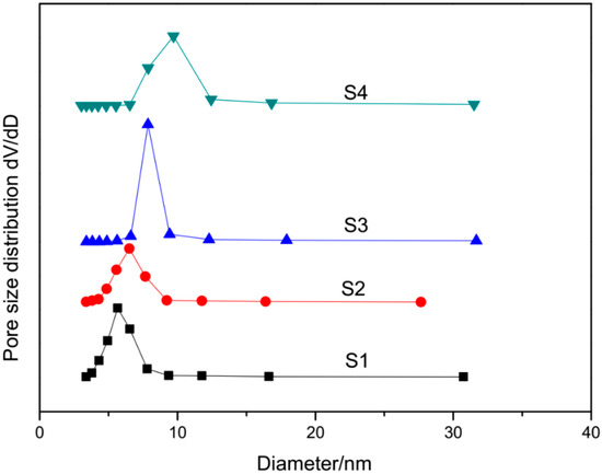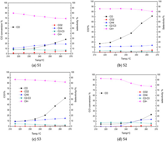 The catalytic performance of Co/SBA–15 catalysts during FTS was evaluated at 215–265 °C and 2 MPa for 15 h. The gas hourly space velocity (GHSV) in all tests was 3600 h−1. Figure 9 presented the influence of the reaction temperature on CO conversion and product selectivity for Co/SBA–15 catalysts with different pore sizes. All Co/SBA–15 catalysts exhibited low CO2 selectivity and high C4+ hydrocarbon selectivity (~80%), which can be attributed to the well pore arrangement of SBA–15. The variation of the pore size in 4.9–10 nm had no obvious effect on C4+ selectivity, except for S1 catalyst. The above result was agreed with the previous literatures [13,27]. The larger cobalt particles were formed on the larger pore size of the support, which was easier to form a long chain of hydrocarbon [13]. However, the further increasing the pore size of catalyst had no significant effect on C4+ selectivity. Prieto et al. stated the length of the pore in catalyst was more important than the pore size for the catalyst activity [20]. In this test, S2 has the higher CO conversion and C4+ selectivity. The length of S2 catalyst is the longest among the four catalysts. Moreover, the Co particle was more uniformly distributed on SBA–15, as shown in Figure 8.