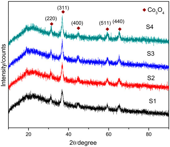 The XRD patterns in Figure 6 showed there was the diffraction peaks at 2θ = 0.7°, which was characteristic of the hexagonal mesoporous structure (p6m) [24,25]. This reflected the ordered structure of SBA–15 was kept after the impregnation of cobalt. The high-angle XRD patterns of catalysts were displayed in Figure 7. Diffraction peaks 31.3, 36.9, 45.1, 59.4, and 65.48 corresponds to the planes (220), (311), (400), (511), and (440) of Co3O4 spinel phase (JCPDS 42-1467) [26].