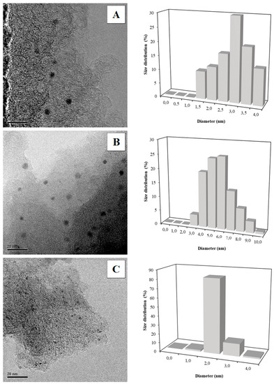 TEM images (left) and metal particles size distributions (right) of catalysts reduced at 450 °C: (A) Pt/C; (B) Pd/C; (C) Rh/C.