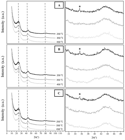 The X-ray diffraction (XRD) profiles of the catalysts reduced at different temperatures (Figure 3) show the characteristic peaks of the carbon support (dash lines) at 2θ values nearly 26° (planes 002), 43° (planes 100, 101 and 102, indistinguishable) and 80° (planes 110) [42,43,44]. As can be seen, XRD profiles were similar regardless of the reduction temperature. The peaks associated with zero-valent metal, which should be centered at 39.9°, 40.1° and 41.1°, respectively [12,14,44,45], were not observed in these patterns, supporting the small particle size of these metals for all the reduction temperatures investigated, as observed by TEM (Figure 2). In addition, in all cases, one peak appeared at 35° (*) at the lowest reduction temperature (250 °C), associated with the presence of metal chlorides (PtCl2, PdCl2, and RhCl3) from the precursors used in the preparation of the catalysts. Furthermore, these compounds seem to disappear at higher reduction temperatures, since this favors the desorption of Cl from the surface of the activated carbon.