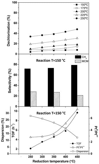Results on the HDC of DCM within 150–250 °C reaction temperatures, at 0.6 kgcat·h·mol−1 space-time, with the Pt/C catalyst reduced at different temperatures.