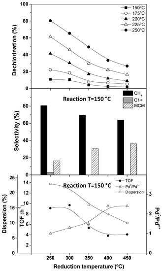 Figure 5 shows the results with the Pd/C catalyst. Substantially different trends are observed with respect to Pt/C. As can be seen, in contrast with Pt/C, overall dechlorination decreased dramatically at an increasing reduction temperature, with the effect being more pronounced at higher reaction temperatures. This can be attributed to the combination of two negative effects (see Table 2): (i) the decrease of the concentration of electro-deficient species, which are known to be the most active species in the HDC of DCM with palladium catalysts [12,19,38], and (ii) the decrease of palladium dispersion. Among the catalysts tested in this study, Pd/C has been proven to be the most prone to sintering. Then, raising the reduction temperature of Pd/C results in an important loss of accessible metallic surface, and the subsequent loss of activity observed. This results in a decrease in DCM conversion (Table S2 in Supplementary Material). In previous studies, it was stablished the optimum Pd0/Pdn+ ratio around 1 for HDC reactions with Pd/C catalysts [19,36]. This is the value found in this study for the catalyst reduced at the lowest temperature. Despite the important loss of metal dispersion, no change in TOF is detected at reduction temperatures higher than 400 °C, where Pd0/Pdn+ ratio also remains constant.