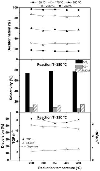 Results on the HDC of DCM within 150–250 °C reaction temperatures, at 0.6 kgcat·h·mol−1 space-time, with the Rh/C catalyst reduced at different temperatures.