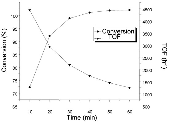 The time-varied conversions and turnover frequencies. Reaction conditions: 51.3 mmol cyclohexanone, 76.9 mmol propane-1,2-diol, 0.1 mol% Co(NO3)2, 0.3 mol% DH2, 5 KPa pressure, 70 °C.