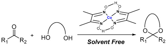 Previously, we reported the catalytic aerobic oxidation of alcohols to their corresponding carbonyl compounds by employing 2,2,6,6-tetramethylpiperidine-1-oxyl (TEMPO), Co(NO3)2 and dimethylglyoxime (DH2) as a combined catalytic system [35]. We found that a considerable amount of acetals were generated if ethanol was used as the solvent. Additional tests revealed that acetal formation occurred efficiently in the presence of Co(NO3)2 and DH2. Taking the results from our previous study on alcohol oxidation [35], we proposed that the in situ generated bisdimethylglyoximatocobalt(II) (Co(DH)2, cobaloxime) played the catalytic role in this acetalization. As far as we are aware, the catalytic properties of such Co complexes for acetalization and ketalization have not been studied yet. Moreover, it was notable that both the DH2 ligand and cobalt salt are simple, commonly used and inexpensive. Herein, the catalytic performance of cobaloxime was investigated by using various cobalt salts for acetalization and ketalization of different carbonyl compounds and polyhydric alcohols (Scheme 1).