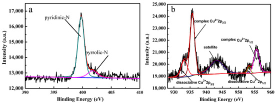 Chemical compositions and their valence states were analyzed via XPS measurements. For Cu-SOCBP, the N 1s spectrum has two obvious peaks. One is the main peak located at 399.7 eV (Figure 3a), and the other is the acromion of the main peak at a higher binding energy of 401.8 eV. Obviously, the peak at 401.8 eV corresponds to pyrrolic-N in the carbazole ring of the ligand, and the peak at 399.7 eV is a definite indication of the presence of pyridinic-N in the composite (Figure 3a). The presence of two types of nitrogen elements was consistent with the structure of Cu-SOCBP. The binding energies of pyridinic-N found in this study were higher than those usually reported for pyridinic-N, and this is an apparent indication of complexation between copper ions and pyridinic-N [29,30]. Furthermore, this also suggests the formation of the supramolecule metal complex, as indicated in Scheme 1.