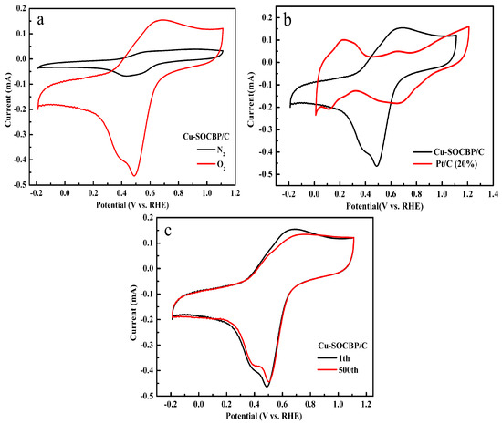 CV was used to evaluate the electrocatalytic activity of Cu-SOCBP/C for ORR. The potential window used in the cyclic voltammogram was from −0.19 V to 1.11 V (vs. RHE) for Cu-SOCBP/C and 0 V to 1.2 V for the commercial Pt/C catalyst. Figure 5a shows two CV curves of the Cu-SOCBP/C catalyst in a medium of 0.1 M PBS (pH = 7); one saturated with O2, and one saturated with N2. The CV curve recorded in the N2 atmosphere shows a pair of irreversible redox peaks at 0.55 V/0.50 V, and these can be ascribed to the redox reaction process of Cu+/Cu2+; this further confirmed the immobilization of copper ions within the catalyst [17,21]. In contrast, when N2 was replaced by O2 as the bubbling gas, it was observed that both the oxidation current and reduction current increased substantially. In particular, the reduction current increased to 0.47 mA, which is nearly six times greater than that measured in the N2-saturated electrolyte. By comparison, it is obvious that the increase in the reduction current was because of the reduction of oxygen catalyzed by the Cu-SOCBP/C-modified electrode. Thus, it is preliminarily concluded that Cu-SOCBP/C has electrocatalytic activity for ORR, and this is consistent with the Cu-Nx-enriched structure [17,21].