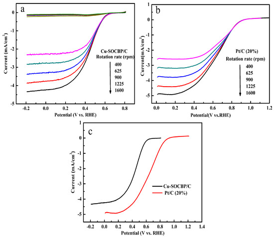 The RDE curves of the catalysts had roughly the same shape, and can be divided into two obvious different regions: one is the kinetic/diffusion current region, and the other is the diffusion control region. It should be noted that different potential windows were selected for each of the catalysts due to their expected different onset reduction potentials (Eonset). For the Cu-SOCBP/C catalyst, the kinetic/diffusion current region was observed from 0.2 V to 0.62 V, and in this region, the reaction rates were controlled simultaneously via charge transfer and the mass transfer rate. At the same time, the diffusion control region of Cu-SOCBP/C was found under 0.2 V; in this region, the reaction rate was only controlled via the mass transfer rate, and the linear polarization curves have well-defined plateaus with a constant maximum current value [33].