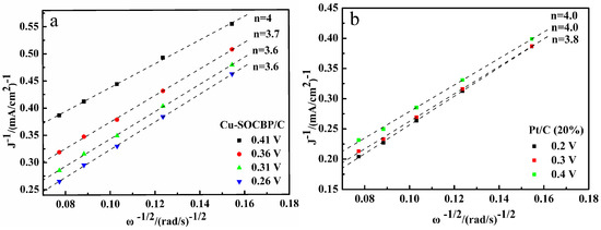 The electron transfer number (n) involved in the ORR process is a pivotal parameter in determining the catalytic activities of ORR materials; n can be obtained via routine electrochemical measurements. For this purpose, LSV curves of the catalysts (including Cu-SOCBP/C and Pt/C) were record on an rotating disk electrode (RDE) electrode at different rotating rates from 400 rpm to 1600 rpm. Figure 6a shows that, at different rotating rates, there were only tiny currents in the PBS that was saturated with N2. However, the current densities increased rapidly when the testing buffer was saturated with oxygen, and this was apparently caused by the catalytic reduction of oxygen in the buffer solution (Figure 6b).