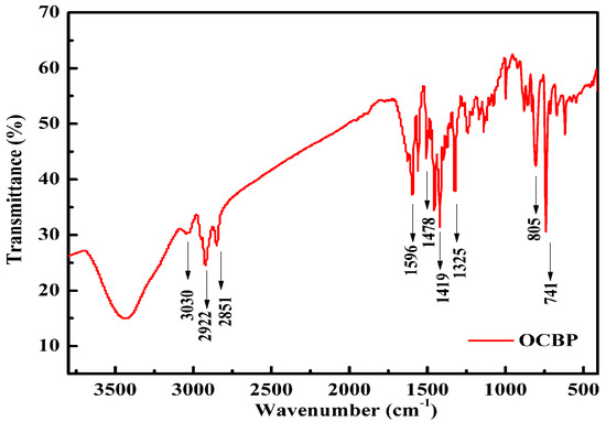 Also, Figure 12 shows the IR spectrum of OCBP. Assignment of the vibrational bands is as follows [40]: the peak at 3030 cm−1 corresponds to aromatic C–H stretching, and the peaks between 2922 and 2851 cm−1 correspond to C–H stretching of aliphatic side chains. Bands at 1596–1478 cm−1 and 1325 cm−1 are ascribed to the stretching vibrations of the C=N bond (phenanthroline ring) and the C–N bond (carbazole ring), respectively, and this is direct evidence for the linkage of the phenanthroline and carbazole ring. The bands in the region of 1478–1419 cm−1 are assigned to the C=C skeleton vibration of the benzene ring. In addition, the peak at 1325 cm−1 corresponds to the stretching vibration of the C–N bond in the phen ring, and the strong peak at 741 cm−1 corresponds to the out-of-plane bending vibration of the C–H bond on the phen ring. The peak at 805 cm−1 is attributed to the out-of-plane bending vibration of the adjacent C–H hydrogen atoms on the carbazole ring. In all, the data of the Infrared spectroscopy (IR) further confirm the successful synthesis of the desired OCBP compound.