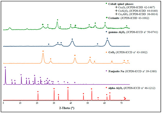 Regarding palladium-based materials, different diffractograms show only the presence of the support, a sign that no supported palladium phase was detected. Nevertheless, the elementary analysis confirms the presence of palladium in several materials with relatively good depositionrates: this indicates that the palladium is deposited in the form of small nanoparticles whose size is lower than the detection limit of the diffractometer. This hypothesis was confirmed by hydrogen chemisorption measurements that indicate particle sizes between 1.8 and 8.1 nm. Concerning the Co6Al1.2Ce0.8Ox material, denominated CoAlCeO, the diffractogram reveals X-ray patterns characteristic of spinel-type oxides MIIMIII2O4 [24,25,26] corresponding to Co3O4, CoAl2O4 or Co2AlO4. In addition to the spinel phase, the diffraction pattern also showed the presence of a ceria phase (CeO2) (Figure 1).