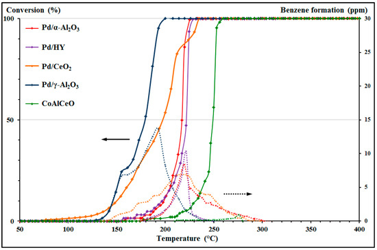 To achieve real VOCs total oxidation, the working temperature must be set assuming the total oxidation of the reactant and its byproducts. This fact is supported by the toxic and regulatory aspects related to benzene. Therefore, the classification of the catalysts by their performance must be reassessed. Subsequently, according to the T50 and T100, the ranking is as follows, from the most efficient to the least efficient: Pd/γ-Al2O3 > Pd/α-Al2O3 > Pd/CeO2 > Pd/HY > CoAlCeO. Considering the emissions of benzene, as Tf, this classification may be reviewed as follows: Pd/γ-Al2O3 > Pd/HY > CoAlCeO > Pd/CeO2 > Pd/α-Al2O3. The difference between the T100 value of Pd/γ-Al2O3 and Pd/HY catalysts is then reduced from 42 °C to 5 °C by considering the Tf value corresponding to the temperature at which toluene is totally converted. Thus, the performances of these two materials are very close. Moreover, if the CoAlCeO catalyst exhibits lower performance considering only T50 and T100 values, it is by far the lowest benzene emitter and consequently, accounting for this point, CoAlCeO is among the best catalysts for toluene oxidation.