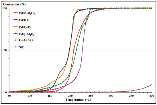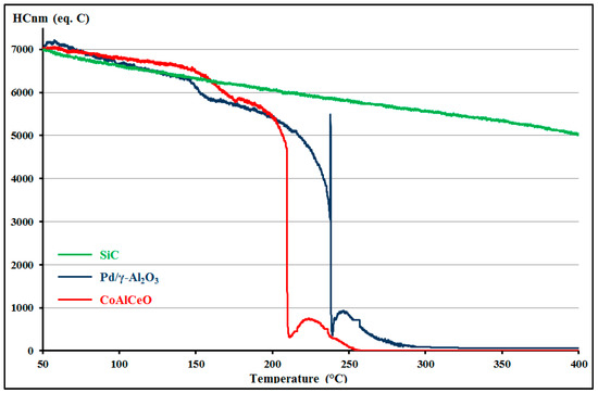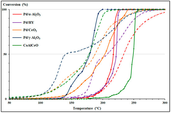 Abatement curves of the complex mixture on Pd/γ-Al2O3 and CoAlCeO catalysts.