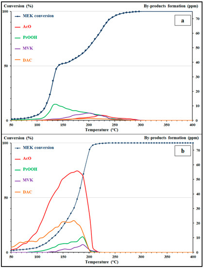 MEK conversion and MEK byproducts formation versus temperature for (a) Pd/γ-Al2O3 and (b) CoAlCeO catalysts (AcO: acetaldehyde; PrOOH: propionic acid; MVK: methyl-vinyl-ketone; DAC: diacetyl).