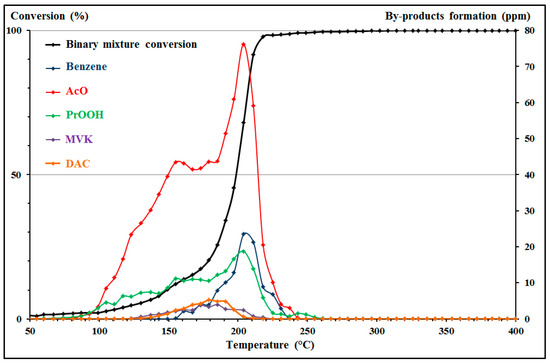 Regarding the effect of byproducts on the behavior of the mixture, their profiles were followed according to the conversion and temperature. The results show the emission of all byproducts already detected during the study of toluene and MEK oxidation: benzene, acetaldehyde (AcO), propionic acid (PrOOH), methyl vinyl ketone (MVK), and diacetyl (DAC). Additionally, the emission profiles present significant changes due to the mixing effects. Indeed, the persistence, P, and the maximum quantity emitted observed Qmax, are significantly changed. Figure 7 shows the emission profiles of the byproducts from the binary mixture oxidation on Pd/CeO2.