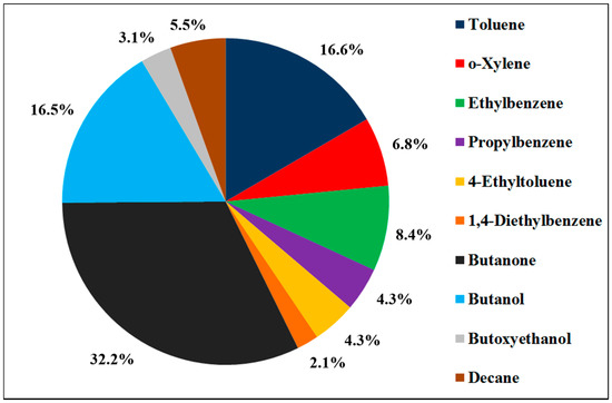 The literature on VOCs’ oxidation systematically studied models exhausts where VOCs’ concentration and flow rate are perfectly controlled, while only a few articles focus on the study of VOCs mixtures [7,13,14,15,16,17,18,31,32]. As in this study, these articles highlight different inhibitory or beneficial effects derived from interactions between compounds. However, a binary or ternary mixture studied at the laboratory level remains far from the reality of an industrial effluent, which can be made up of many more compounds (10 to 50 compounds) with variable compositions and concentrations over time. To get closer to industrial applications, we further studied a more complex mixture of VOCs that was established based on the composition of an industrial effluent and will therefore be referred to as a simulated industrial exhaust. In the industry, part of the manufacturing process is to apply lacquers and paints to metal surfaces, the consequence being that industry emits significant amounts of gaseous effluents with a high concentration of VOCs and a high flow rate. These effluents contain mostly aromatic compounds, mainly toluene, and oxygenated compounds, mainly MEK, as well as traces of paraffins (C9–C11). The liquid mixture used here to simulate the industrial effluent of VOCs was constituted by selecting six aromatic compounds (toluene, o-xylene, ethylbenzene, propylbenzene, 4-ethylbenzene, and 1,4diethylbenzene), three oxygenates (butanone, butanol, butoxyethanol), and a paraffin (decane). The concentration of each substance is fixed to a concentration of 10 vol% in the liquid phase. This mixture was studied on the same experimental setup as in previous studies, the mixture being placed in a saturator. The temperature of the saturator was set so as to fix a value of 7000 ppm carbon equivalent (ppm eq. C) in a 100 mL·min−1 air flow, with a total hydrocarbons analyzer COSMA Graphite 655 (Environnement SA, Poissy, France). The gas phase composition determined by microGC is given in Figure 8.