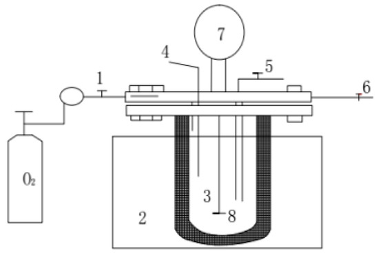 Diagram of wet oxidation reactor.1: Oxygen supply; 2: Heating jacket; 3: Oxidation reactor; 4: Thermocouple; 5: Discharge of gas; 6: Bleeder valve; 7: Pressure meter; 8: Stirrer.