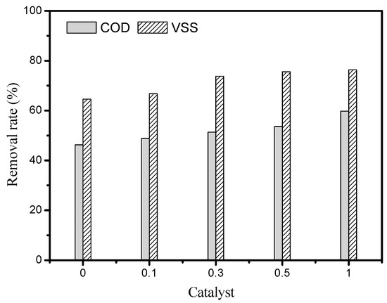 Effect of catalyst amount on the COD and VSS removal rates (Time: 60 min; Temp.: 220 °C; Oxygen dosage: 1.0 MPa).