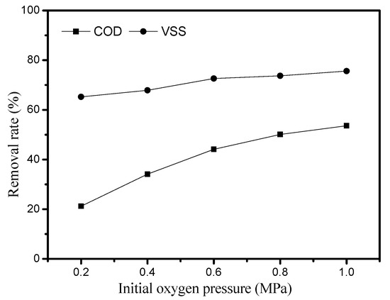 To gain better insight into the effect of oxygen pressure on COD and VSS removal rates, experiments were conducted under oxygen pressures varying from 0.2 to 1.0 MPa. The results are shown in Figure 5. It can be seen that oxygen pressure plays an important role in COD and VSS removal. It is found that COD removal increases with increasing oxygen pressure. This behaviour was expected because the increase of the oxidant concentration usually leads to an increase in the oxidation rate. These results indicate that high oxygen pressures effectively eliminate refractory and toxic organic compounds and yield high COD and VSS conversions in the WAO process. Under high oxygen pressures, the amount of dissolved oxygen increases in the solution, which can be helpful for the formation of strong oxidation species. However, the COD and VSS removal rate changed little with the increase of oxygen pressure from 0.8 to 1.0 MPa. The reason may be that some by-products formed during the wet oxidation are non-oxidizable under the employed conditions because a plateau is observed in the oxygen pressure range from 0.8 to 1.0 MPa. These results indicate that the amount of oxidizing agent is enough for the wet oxidation.