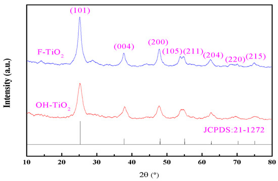Figure 1 shows the X-ray diffraction (XRD) patterns of as-prepared F-TiO2 and OH-TiO2 samples. No apparent peaks of other phases were found, meaning that both samples were pure crystals. The XRD peak positions for both the samples at 2θ were 25.28°, 37.80°, 48.04°, 53.89°, 55.06°, 62.68°, 70.31° and 75.03°, which matches well with anatase TiO2 (JCPDS card No. 21-1272) and different from P25 (mixed crystals of anatase and rutile TiO2). The characteristic diffraction peak intensity of F-TiO2 is obviously stronger than that of OH-TiO2, meaning that the crystallinity of the sample can be increased with fluorine ions, which aligns with the results of Xiang et al. [31]. After NaOH treatment, the crystal form of the catalyst changed, which aligns with the results of Hou Chentao et al. [32].