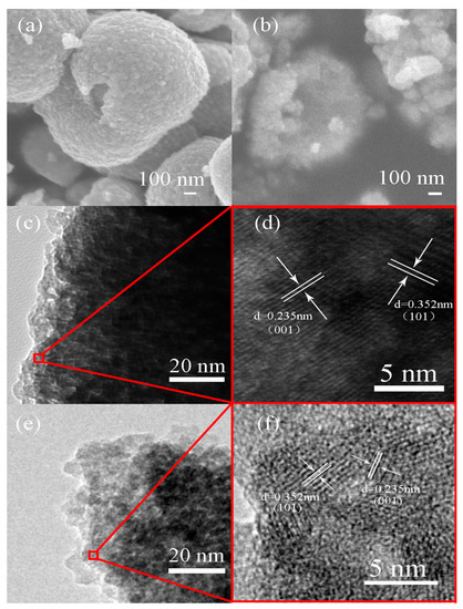 Field emission Scanning electron microscopy (FE-SEM) and high-resolution transmission electron microscope (HRTEM) of as-prepared F-TiO2 and OH-TiO2 samples. (a) FE-SEM images of F-TiO2; (b) FE-SEM images of OH-TiO2; (c,d) HRTEM images of F-TiO2; (e,f) HRTEM images of OH-TiO2.
