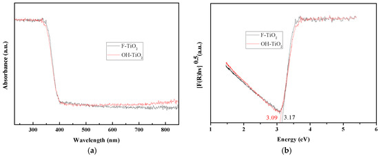 The UV-vis diffuse reflectance spectra (DRS) and bandgap of the as-prepared samples are shown in Figure 4. From Figure 4a, the F-TiO2 and OH-TiO2 catalysts of are almost identical in terms of absorption between 230 and 550 nm. In the range of 550 to 850 nm, OH-TiO2 has a light stronger absorption than F-TiO2, showing that OH-TiO2 exhibits stronger light absorption ability in the visible light range. From Figure 4b, the OH-TiO2 bandgap is 3.09 eV, which is somewhat smaller than that of F-TiO2 (3.17 eV). This may be attributed to the nest-like microstructure morphology of OH-TiO2, which may promote light-scattering inside the pores of the shell wall and enhance absorption in light [25].