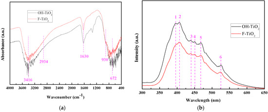 The Fourier transform infrared (FT-IR) spectroscopy was employed to investigate the chemical bonding of the catalysts (Figure 5a). The absorption peaks of F-TiO2 and OH-TiO2 were observed at 3416 cm−1 and 1630 cm−1, respectively, which could be assigned to the adsorbed and bound H2O on the particles, respectively [38,39,40]. The span between 2934 and 3416 cm−1 is attributed to the O–H bonds or associated O–H. O–H bonds appeared both in F-TiO2 and OH-TiO2 [39,40]. The peaks around 672 cm−1 correspond to the characteristic absorption of Ti–O [29]. The peaks around 930 cm−1 are attributed to F–Ti which disappeared after NaOH washing, meaning F was exchanged by OH.