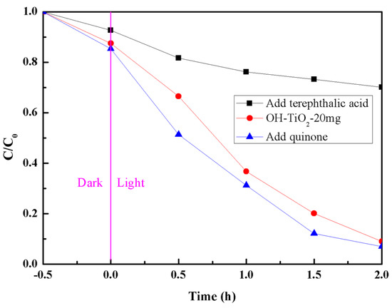 Terephthalic acid (3 mmol/L) and p-benzoquinone were added to a mixed solution containing 20 mg of OH-TiO2 and 100 mL of 10 mg/L of methylene blue solution, and methylene blue was degraded as a control.