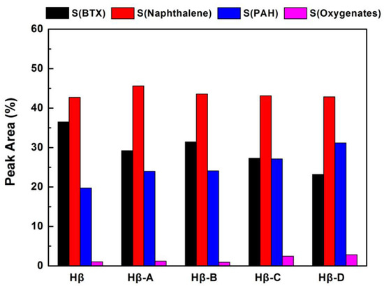 The acid sites of zeolites can promote deoxygenation, decarboxylation, and decarbonylation, as well as cleavage, oligomerization, alkylation, isomerization, cyclization, and aromatization, to further convert the depolymerization products of lignin. Over the parent HZSM-5 and Hβ Zeolites, there are significant differences in the selectivity of condensable volatiles. Using HZSM-5 catalyst, 27.2% of oxygenates still exist in the condensable volatiles, mainly in trimethoxybenzene. On Hβ zeolite, oxygenates almost disappeared completely, only 1%. The deoxygenation effect of Hβ is much higher than that of HZSM-5. Considering the difference in pore structure between the two zeolites, more lignin-derived oxygenates can diffuse into the larger pores of Hβ, even larger molecules trimethoxybenzene; thereby, most of oxygenates can be effectively converted. It has also been reported previously that HZSM-5 is invalid for the conversion of bulkier lignin monomers due to size exclusion or pore plugging, while Hβ is very effective for deoxygenation of lignin-derived oxygenates [13]. Zeolite strong acid sites are not the unique factor to achieve high conversion and selectivity to aromatics. The two most essential parameters are diffusion and the active site.