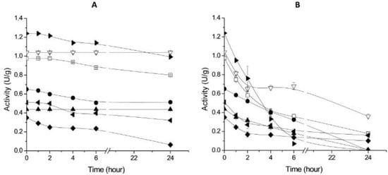 Thermal stability of F. verticillioides lipases (A) 40 °C (B) 50 °C. Symbols: -□- Butyl Sepharose; -●- Hexyl Toyopearl; -▲- Phenyl Toyopearl; -∇- Octyl Sepharose; -►-Octadecyl Sepabeads -◄- CNBr-activated Lip1 and -♦- CNBr-activated Lip2.