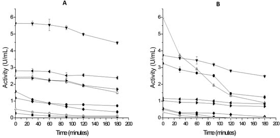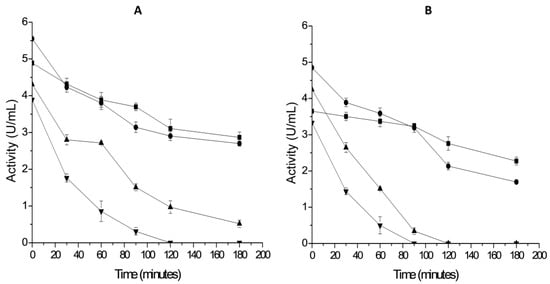 Thermal stability of pure lipases (A) Lip1 (B) Lip2. pH symbols: -■- 30 °C; -●- 40 °C; -▲- 50 °C; -▼- 60 °C.