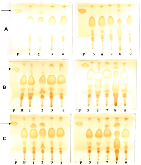 Transesterification assay with ethanol in different oils (black arrow). (A) Control (B) Lip1 adsorbed in octadecyl (C) Lip2 adsorbed on octadecyl. P = ethyl oleate 1%, B = soy oil control, 1 = soy oil, 2 = macaúba almond oil, 3 = canola oil, 4 = corn oil, 5 = pequi oil, 6 = sunflower oil, 7 = olive oil, 8 = macaúba pulp oil, 9 = sesame oil.