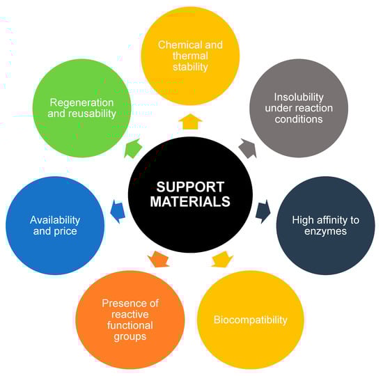 A very broad variety of materials of various origins can be used as supports for enzyme immobilization. These materials may, in general, be divided into organic, inorganic and hybrid or composite. The support should protect the enzyme structure against harsh reaction conditions and thus help the immobilized enzyme to retain high catalytic activity [9]. Moreover, use of a suitable material, for example hydrophobic carriers in lipase immobilization, may additionally increase the activity of the biocatalyst [10,11]. However, there are some limitations in this area, because the matrix must not have a negative effect on the structure of the enzyme and should not disturb the enzyme more than is required to create stable enzyme–matrix interactions. Additionally, there should be affinity between the functional groups of the two materials to allow the formation of these enzyme–matrix interactions and effective binding of the enzyme to the support. This is particularly important in the case of covalent immobilization [12]. The carrier should expose the active sites of the catalyst for easy attachment of substrate molecules and to reduce diffusional limitations of the substrates and products [13]. The main required features of support materials for effective enzyme immobilization are summarized in Figure 1.