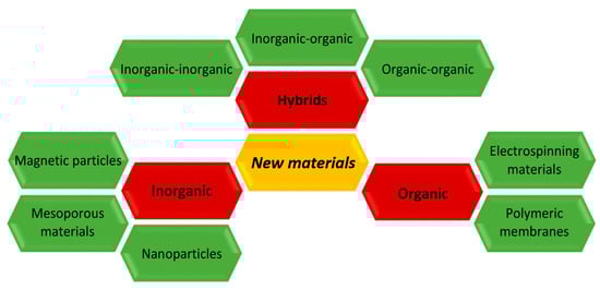 Possibilities for practical applications of immobilized enzymes are continuing to grow. For this reason, discovery and use of New materials with desired properties, tailored to particular enzymes, has recently become extremely important. These materials, of both organic and inorganic origin, are characterized by exceptional thermal and chemical stability and very good mechanical properties. Moreover, these support materials are produced in various morphological shapes with controllable particle sizes, usually at nanoscale, which make them suitable for use with enzymes. Furthermore, these materials possess remarkable quantities of various functional groups, corresponding to the chemical groups of the proteins, which enhance enzyme binding and surface modification [78]. However, particularly during the last decade, scientific attention has been directed towards hybrid and composite materials, which combine properties of both composite precursor types and thus maximize their advantages [79]. Hence, with the use of New materials (see Figure 3) as enzyme supports, control of the technological process is improved, the immobilized enzymes exhibit enhanced catalytic efficiency and the purity and quality of the reaction products increase compared to the processes catalysed by enzymes immobilized using the Classic materials.