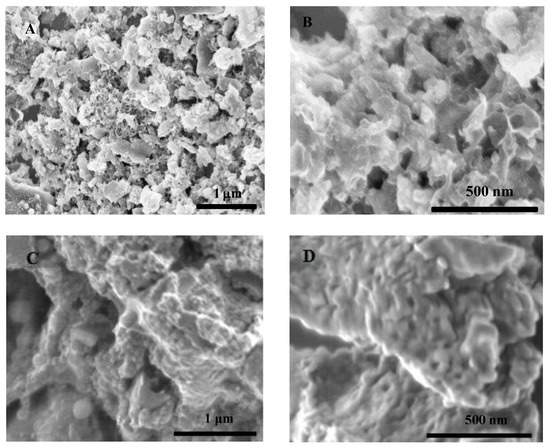 The Fe2O3/N-PCs composites were prepared by using a hydrothermal, heat treatment processes together with a freeze-drying method (Scheme 1), in which organic-rich biomass, i.e., mulberry leaves, serve as a carbon and nitrogen source; FeCl3 acted as an iron source and contributed to the formation of Fe2O3 during the calcination. The porous structures of Fe2O3/N-PCs and N-PC were collected by SEM images. As shown in Figure 1A,B, the typical Fe2O3/N-PCs exhibits a mesoporous structure with the pore sizes around 100 nm. The N-PCs exhibits an amorphous porous structure which is shown in Figure 1C,D. According to the SEM images of Fe2O3/N-PCs and N-PCs, the formation of Fe2O3 with a structure of mesoporous can be observed. The formation of mesopores in Fe2O3/N-PCs and N-PCs is associated with the decomposition of diverse organic compounds that exist in mulberry leaves with the release of pyrolysis gases. Also, we can speculate that such a porous structure can promote the accumulation of abundant iron oxide during the heat treatment process so as to facilitate the mass transfer and obtain more active sites. It was reported that the amorphous iron oxide can facilitate mass transfer, which can reduce the area specific resistance of the 3D heterostructured cathode to 50% of that of the unmodified one by 0.01 Ω cm2 only [23]. Meanwhile, the C, N, Fe and O element ratios in Fe2O3/N-PCs-800, Fe2O3/N-PCs-850, and Fe2O3/N-PCs-900 from EDX analysis are listed in Table S1.