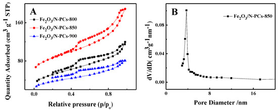 N2 adsorption and desorption isotherm was performed to investigate the porosity of Fe2O3/N-PCs (Figure 2A). The specific surface area of Fe2O3/N-PCs-800, 850, 900 were measured to be 188.6 m2·g−1, 313.8 m2·g−1 and 139.5 m2·g−1 respectively, in which Fe2O3/N-PCs-850 has the highest surface area. Moreover, Figure 2B reveals a typical type IV pattern with an H4 hysteresis loop, demonstrating the existence of a developed mesoporous structure in Fe2O3/N-PCs-850 with a narrower pore size distribution of about 3.5 nm. Thus, Fe2O3/N-PCs-850 with the highest surface area may contribute to the exposure of catalytic active sites and mass transport involved in ORR, which is favorable for improved electrocatalytic performance.
