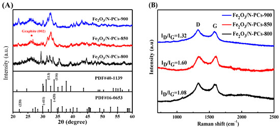 XRD pattern (A) and Raman spectra (B) of Fe2O3/N-PCs-800, Fe2O3/N-PCs-850 and Fe2O3/N-PCs-900.