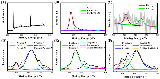 (A) XPS survey spectra of Fe2O3/N-PCs-850; High-resolution C 1s (B) and Fe 2p (C) XPS spectrum of Fe2O3/N-PCs-850; High-resolution N 1s XPS spectrum of Fe2O3/N-PCs-800 (D), Fe2O3/N-PCs-850 (E) and Fe2O3/N-PCs-900 (F).