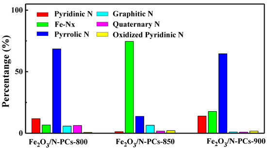 The percentage of six nitrogen species in Fe2O3/N-PCs at different temperature.