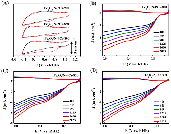 Cyclic voltammograms of Fe2O3/N-PCs-800, Fe2O3/N-PCs-850 and Fe2O3/N-PCs-900 (A) modified GC electrodes in O2- and in N2-saturated 0.1 M KOH at a scan rate of 10 mV·s−1. LSV curves of Fe2O3/N-PCs-800 (B), Fe2O3/N-PCs-850 (C) and Fe2O3/N-PCs-900 (D) on RRDE at a scan rate of 5 mV·s−1 with various rotation rates.