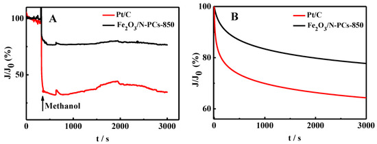 To examine the possible crossover effects, the electrocatalytic durance of Fe2O3/N-PCs-850 and 20% Pt/C against the poisoning of methanol were measured by injecting 3 mL methanol at 350 s in an O2-saturated alkaline solution. Figure 8A shows that the ORR current density of commercial Pt/C catalyst had a sudden change upon the introduction of methanol owing to the electrochemical oxidization of methanol. However, the Fe2O3/N-PCs-850 retained more than 75% of its initial current density under the same condition, revealing its superior selectivity over 20% Pt/C catalyst, which remained about 40%. This may be explained by the excellent stability of the synergetic effect of N and Fe as the active sites for oxygen reduction reaction among the carbon framework. The stability of the prepared Fe2O3/N-PCs-850 was also examined by current-time chronoamperometric measurement at −0.2 V for 3000 s in 0.1 M KOH solution with O2-saturated. After testing for 3000 s, slight performance attenuation (23.2%) was observed for Fe2O3/N-PCs-850 in Figure 8B, whereas performance degradation of 20% Pt/C catalyst degraded significantly with an obvious current loss of 67.2%. These results again demonstrate the advantage of the Fe2O3/N-PCs-850 over 20% Pt/C catalyst.