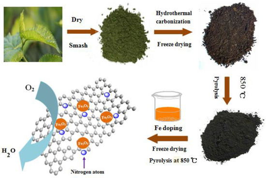 In addition to activity of catalysts, setting up rich porosity of support is also imperative to achieve efficient multidimensional mass and electron transfer pathways of three-phase interface where ORR takes place [26,27,28,29]. A typical work was reported to synthesize a kind of carbon nitride electrocatalyst with multiple pore type by incorporating FeCl3, XC-72R nanoparticles and K4Fe(CN)6 as iron, carbon and nitrogen source, respectively [30]. Compared with the above approach, biomass such as pomelo peels [11], egg [31], coir [32], and seaweed [33] has attracted increasing popularity into the fabrication of porous carbon support material due to its distinctive good accessibility, environmental friendliness and sustainability. Moreover, it has been proven that the carbon materials obtained from direct thermal pyrolysis of biomass usually catalyse the ORR inefficiently through the two-electron transfer route to form peroxide species, thus, its ongoing oxygen reduction (i.e., four-electron transfer process in ORR) needs further catalysis by the introduction of metallic components [34].