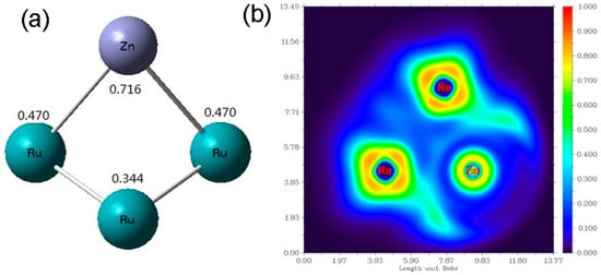 (a) Optimized structure of the Ru-Zn cluster formed by one Zn2+ and three Ru atoms as well as their positive electrical charges; (b) electron density map of one Zn2+ and two closest Ru atoms.