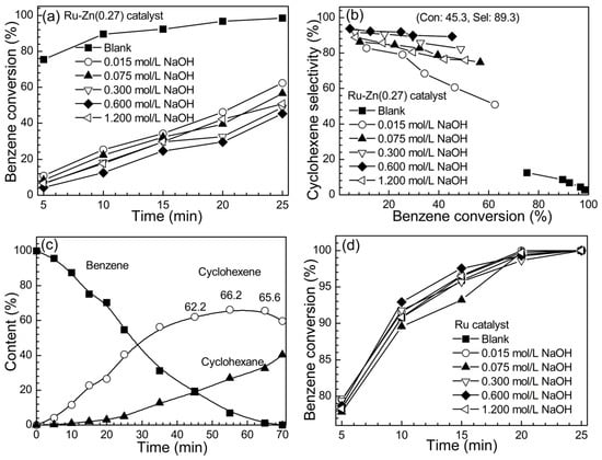 Catalytic activity towards selective hydrogenation of benzene over Ru-Zn (0.27) and monometallic Ru catalysts with different concentration of NaOH as a reaction additive (mcat = 2.0 g, vH2O = 280 mL, vbenzene = 140 mL, T = 423 K, pH2 = 5.0 MPa). (a) Benzene conversion and (b) cyclohexene selectivity over Ru-Zn (0.27) catalyst; (c) reaction course under optimized conditions (0.600 mol L−1 of NaOH); (d) benzene conversion over Ru catalyst.