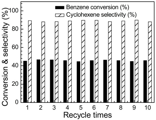 The reusability of Ru-Zn (0.27) catalyst with the addition of 0.600 mol L−1 of NaOH was tested under the same reaction conditions without further regeneration (Figure 8). It can be observed that benzene conversion stays approximately 45% and cyclohexene selectivity maintains around 88% after 10 times of catalytic experiments. Thus, the catalytic system over Ru-Zn (0.27) and NaOH as a reaction additive shows a good reusability for selective hydrogenation of benzene towards cyclohexene. Since NaOH causes much less corrosion of reactor, this catalytic system possesses a great potential for industrial application on selective hydrogenation of benzene towards cyclohexene production.