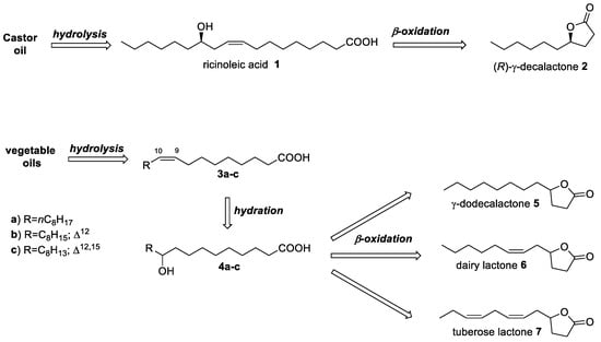 Synthesis of natural (+)-(R)-gamma-decalactone from castor oil and the prospective synthesis of natural C12 lactones gamma-dodecalactone, dairy lactone and tuberose lactone from vegetable oils through exploitation of UFA hydration reactions.