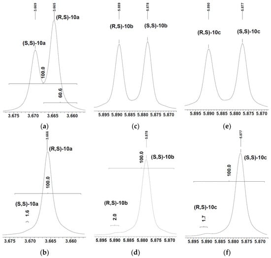1H-NMR analysis of the diastereoisomeric mixtures of (S)-O-acetylmandelate esters 10a–c deriving from 10-hydroxystearic (4a), (12Z)-10-hydroxy-octadecenoic (4b) and (12Z,15Z)-10-hydroxy-octadecadienoic (4c) acid samples either prepared as reference standards (samples a, c, and e) or obtained by Lactobacillus rhamnosus-mediated hydration reactions (samples b, d, f). Samples description: (a) ester 10a prepared using (R)-4a having 21% ee; (b) ester 10a prepared using 4a obtained by hydration of oleic acid; (c) ester 10b prepared using racemic 4b; (d) ester 10b prepared using 4b obtained by the hydration of linoleic acid; (e) ester 10c prepared using racemic 4c; and (f) ester 10c prepared using 4c obtained by the hydration of linolenic acid.