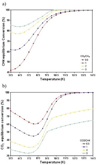 Equilibrium conversion of (a) CH4 and (b) CO2 as a function of temperature and CO2/CH4 ratio at atmospheric pressure for n(CH4 + CO2) = 2 mol. Reprinted with permission from Ref. [39]. Copyright (2011) Elsevier.